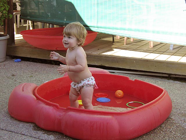 | Day 1.. I become familiar with the tiny pool they call "Crabby", while Mom & Dad & Suzie cavort in the big pool with Kyle. |